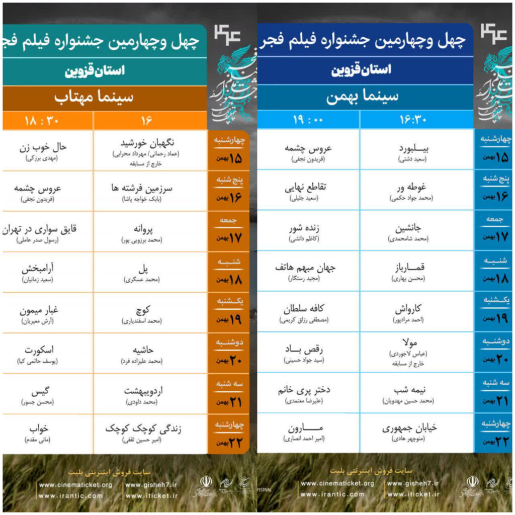 به گزارش خبرنگار پایگاه خبری سینمای خانگی آبیک در استان قزوین ؛ به نقل از روابط عمومی اداره کل فرهنگ و ارشاد اسلامی استان قزوین؛ چهل و چهارمین جشنواره فیلم فجر استان قزوین از ۱۵ بهمنماه کار خود را آغاز میکند و تا ۲۲ بهمن ادامه خواهد داشت. براین اساس، فیلمها در دو سالن سینما مهتاب و سینما بهمن به نمایش درمیآیند.